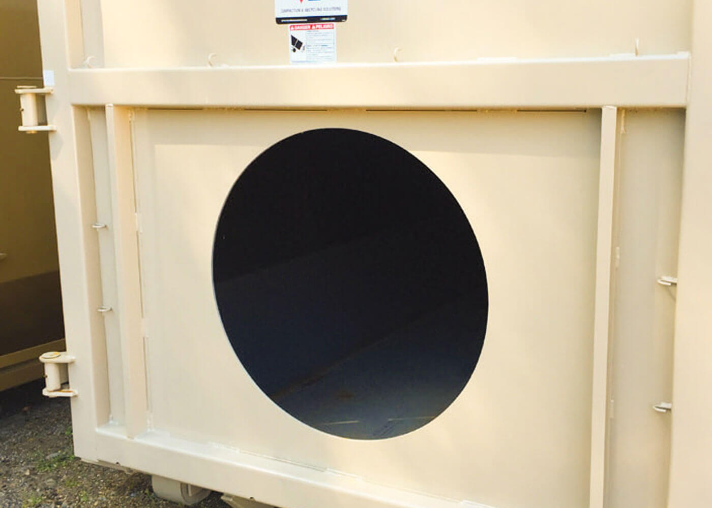 Marathon highly recommends using the optional Round Opening Container Adapter Plate. This option is quickly and easily added to a standard rectangular container opening, and helps to ensure clean container break-away with the least possible spillage of any stationary compactor.