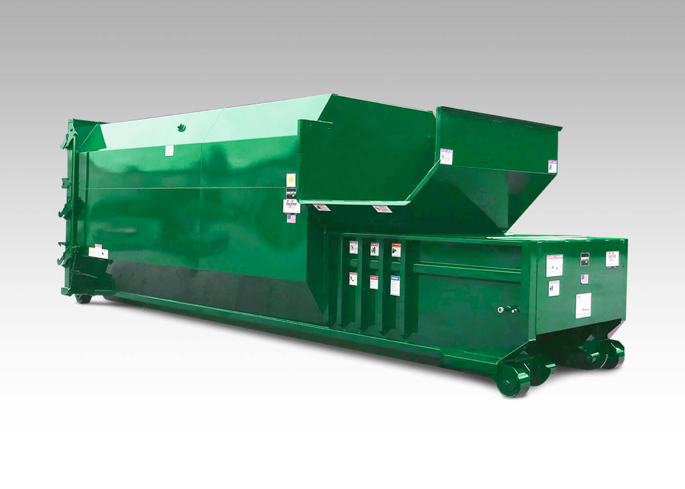 With over 18 tons of crushing power, the RJ-100SC self-contained trash compactor will reduce refuse to a fraction of its original size. The universal double-end pickup and dock-friendly design make the RJ-100SC compactor ideal for dock-fed applications. Other features include fire hose connections on each unit, hinge grease fittings, plus ground and guide rollers.